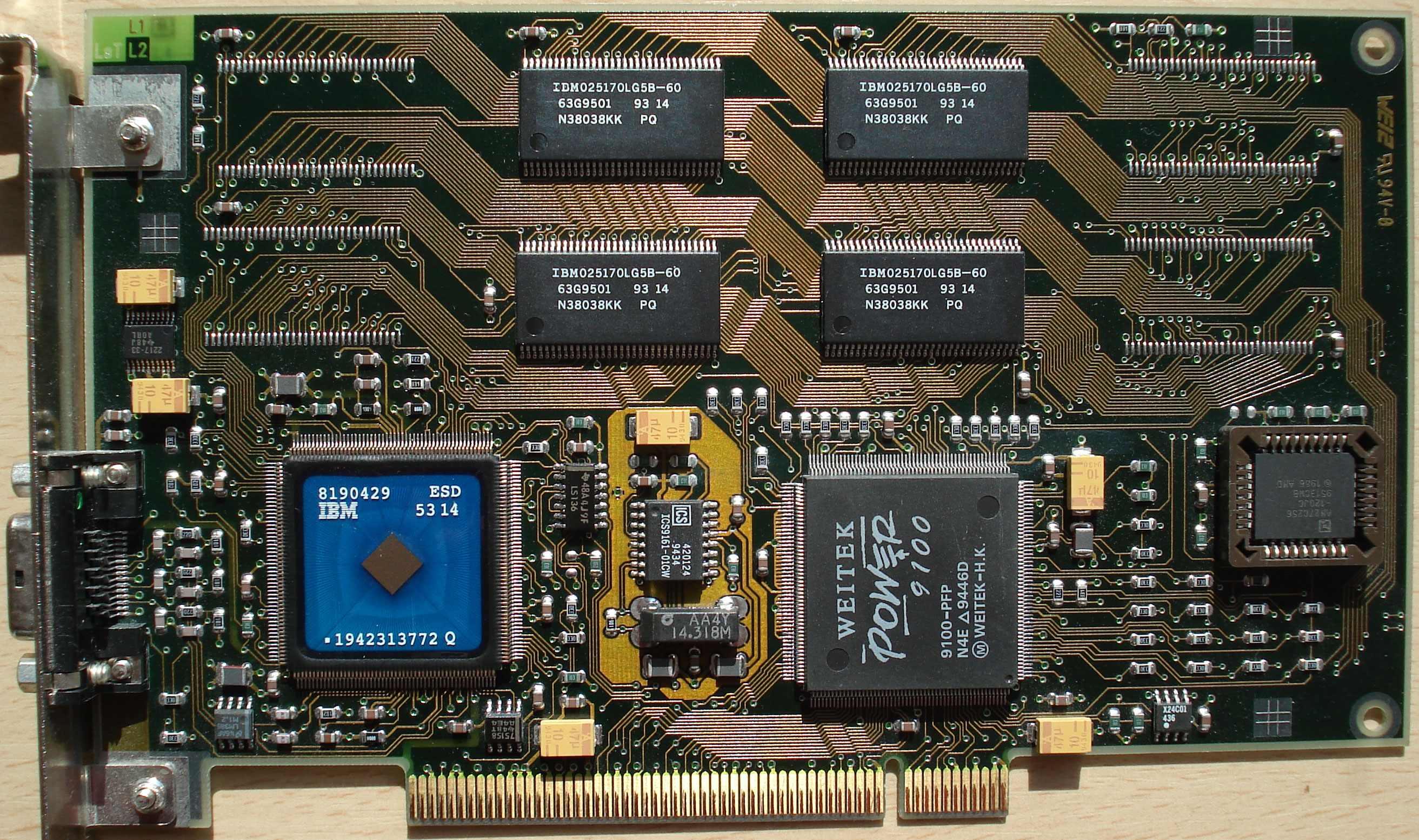 The Weitek Power P9100 is a 64 bit GUI accelerator incorporating the Weitek 5186 core for VGA compatibility. These cards came either with 2 or 4 MB VRAM (G1-2 / G1-4) and 170 MHz or 220 MHz DAC (G1-4 / G1-4H). They are fast in windows for an early PCI card.