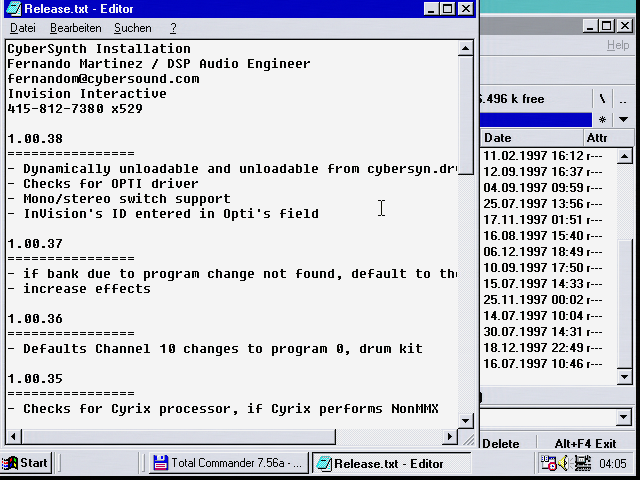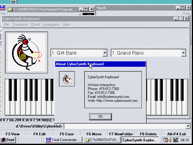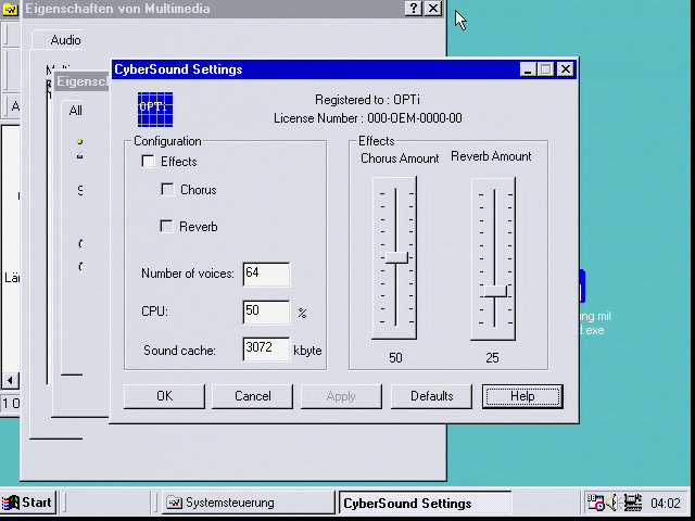 The wavetable is a complete software solution running in Windows 9x. It is Cybersynth from Invision Interactive with a 4 MB soundfont and 64 voices. On the Box it is called OPTiSound 64 Wavetable Synthesizer.