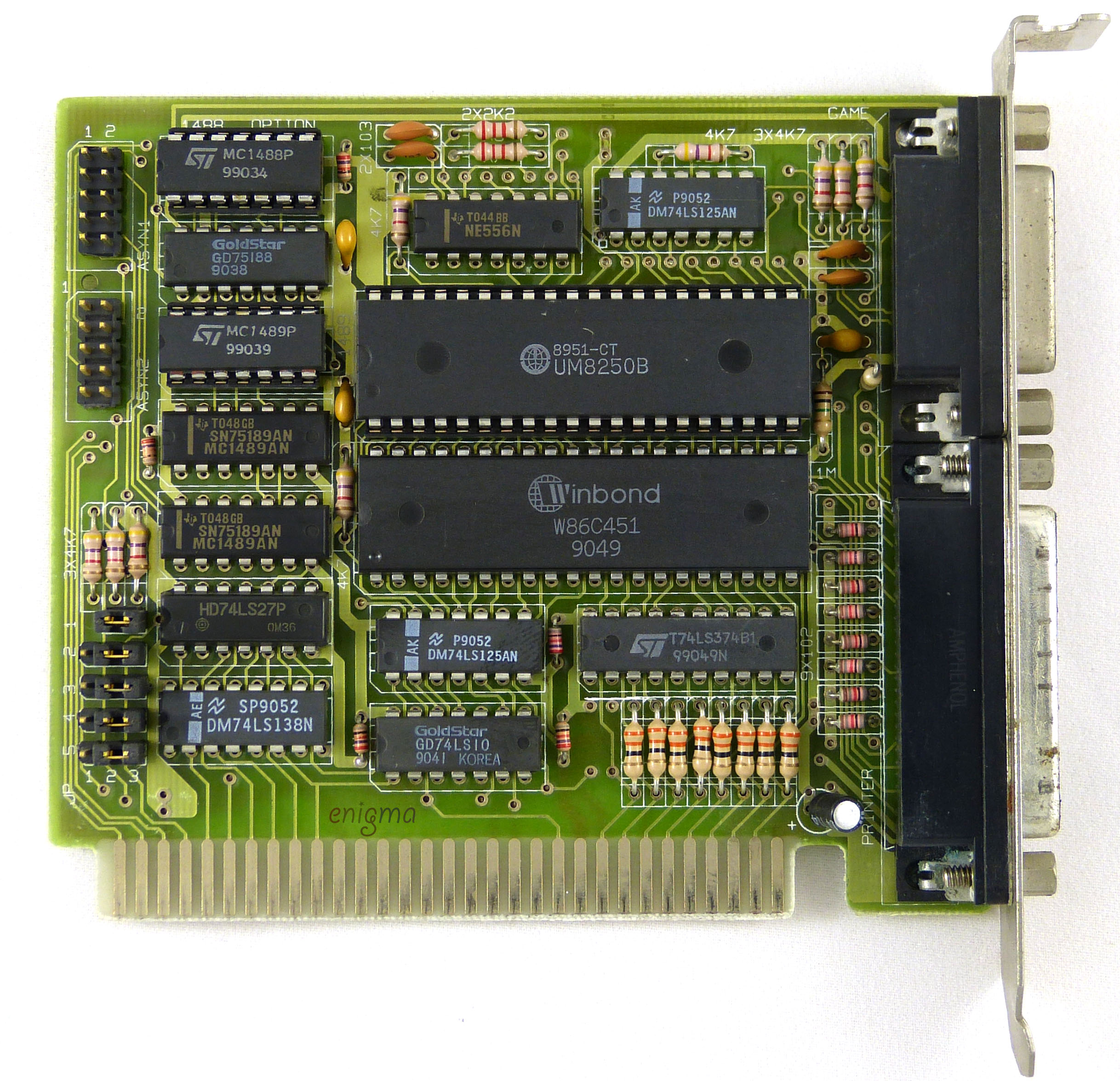 Since the Adaptec controller covers only floppy disk, I needed a controller card for the serial, parallel, game port. Here a common noname 8 bit ISA card suffices. It has two serial ports that are connected with internal cables on a separate shield, parallel port and a game port.